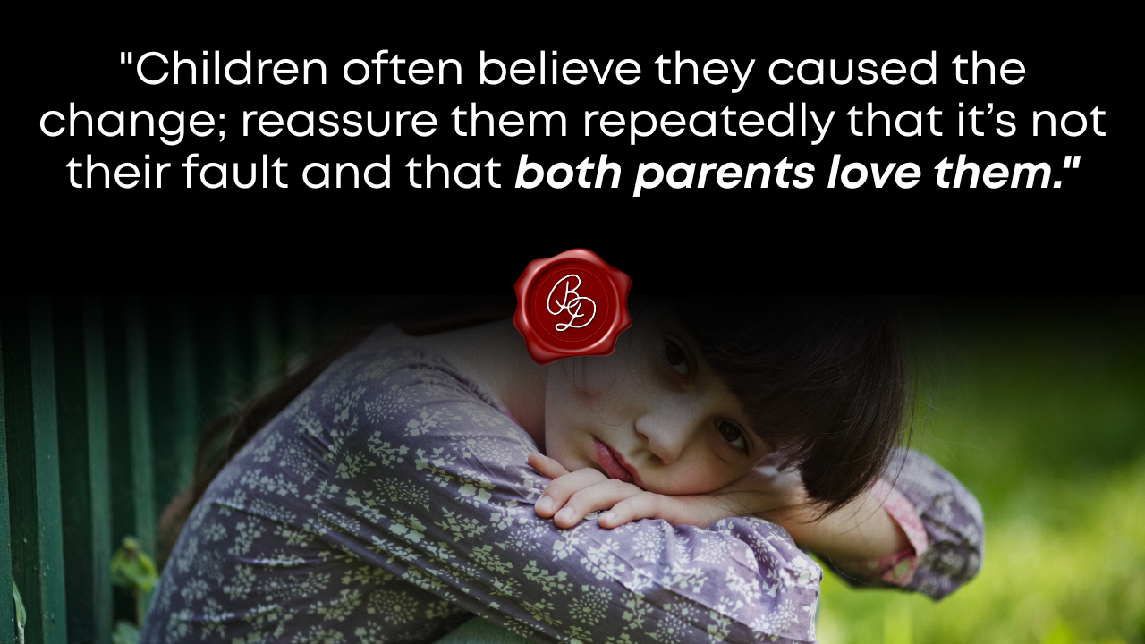 - Reassure them repeatedly that it’s not their fault and that both parents love them. Children often believe they caused the change; clinicians emphasize reassurance as a top priority. (HealthyChildren.org)